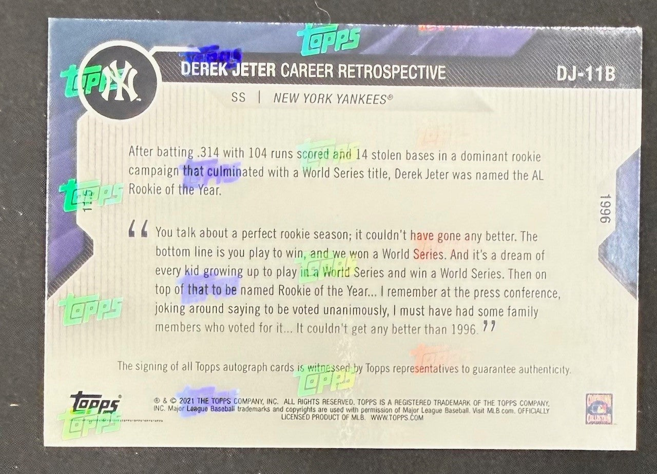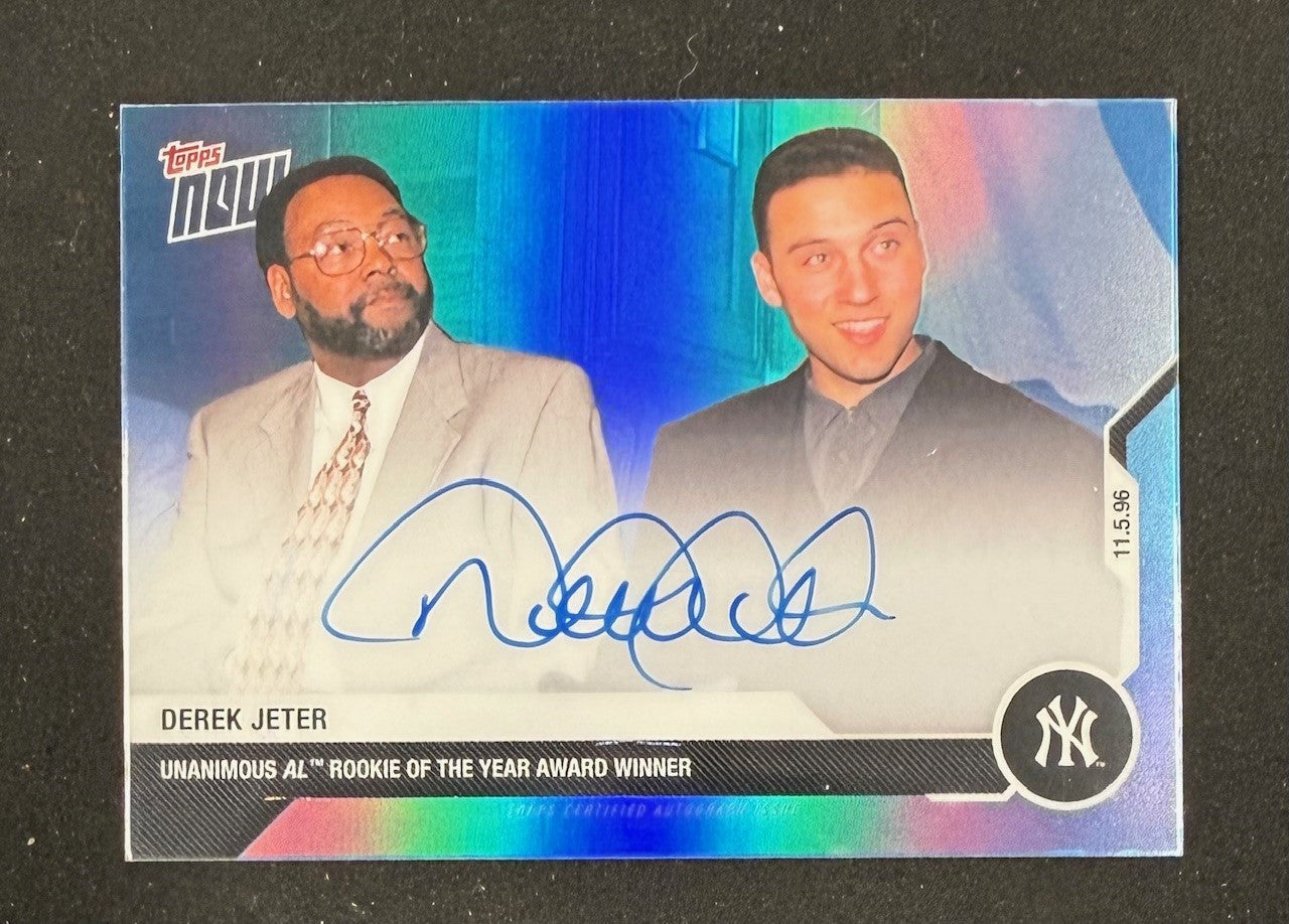 This Derek Jeter 2021 Topps Now Rookie of the Year signed Baseball Card #DJ-11B commemorates his American League Rookie of the Year achievement. Topps Now releases capture historic baseball milestones making signed versions especially collectible for Yankees fans.