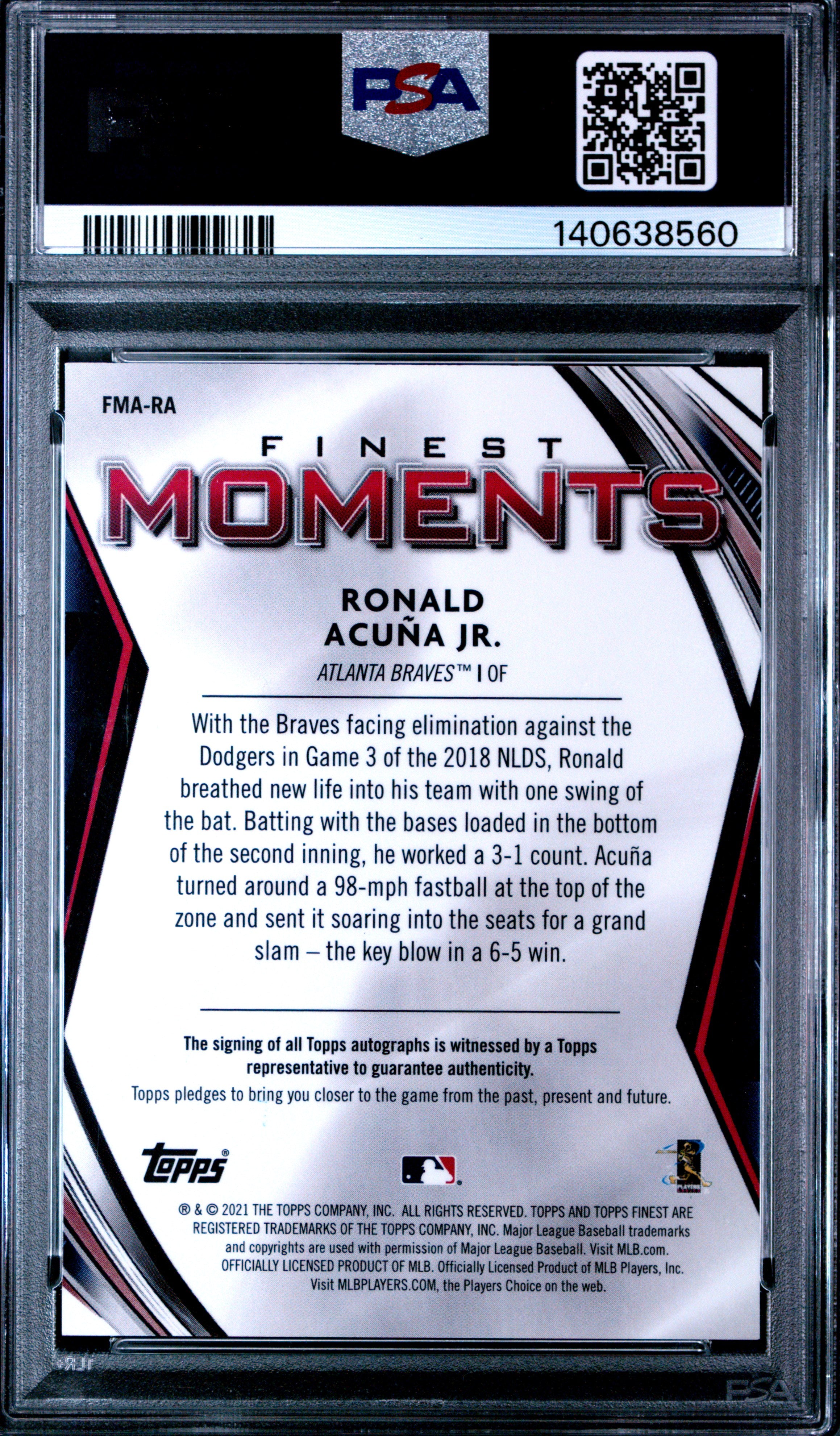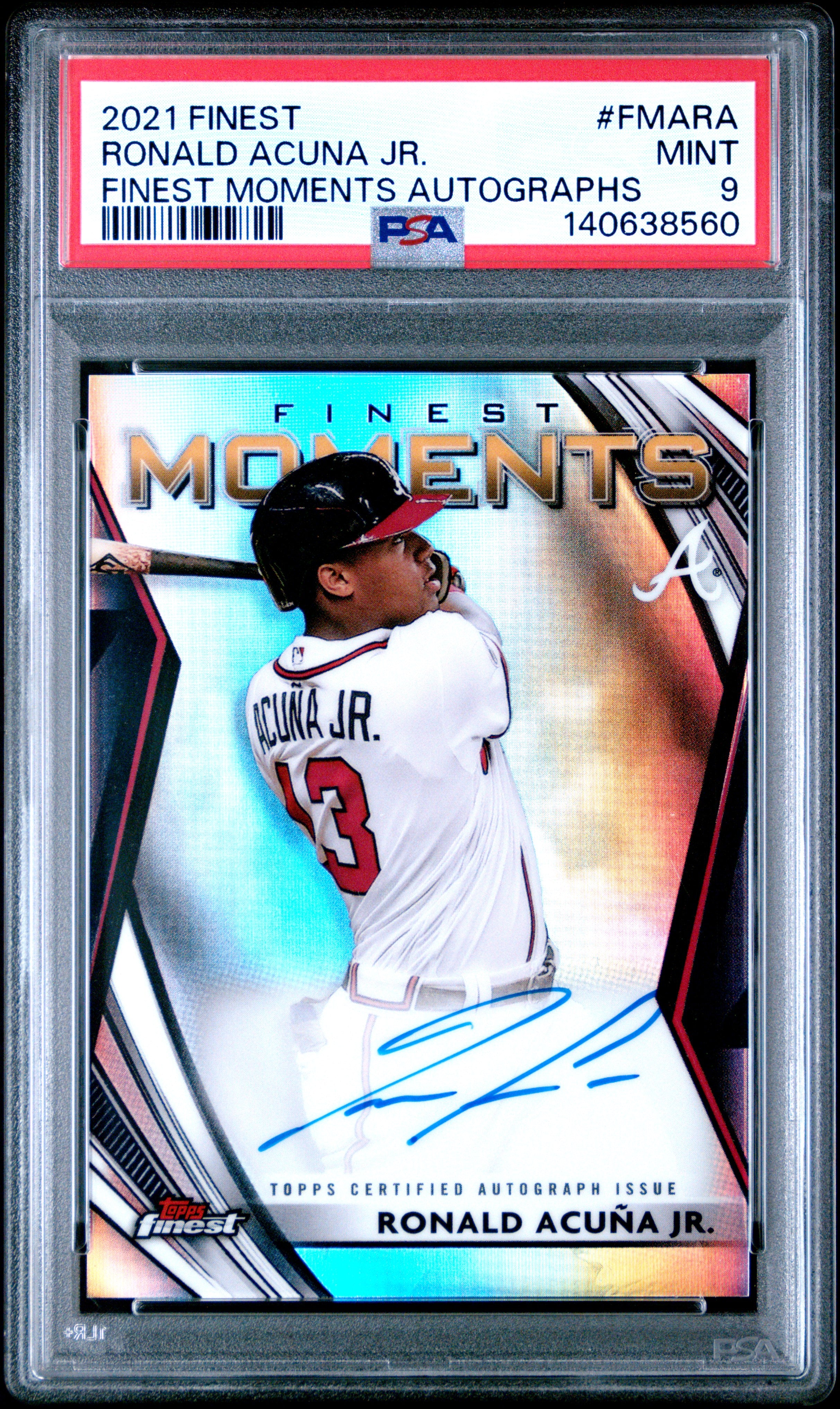 This Ronald Acuna Jr 2021 Topps Finest Moments signed Baseball Card #FMARA features an autograph from the Atlanta Braves superstar. The Finest Moments insert celebrates memorable highlights from Acunas career. The card is graded PSA 9 with a PSA authenticated autograph and encapsulated for long term protection making it a desirable signed collectible for Braves and MLB fans.