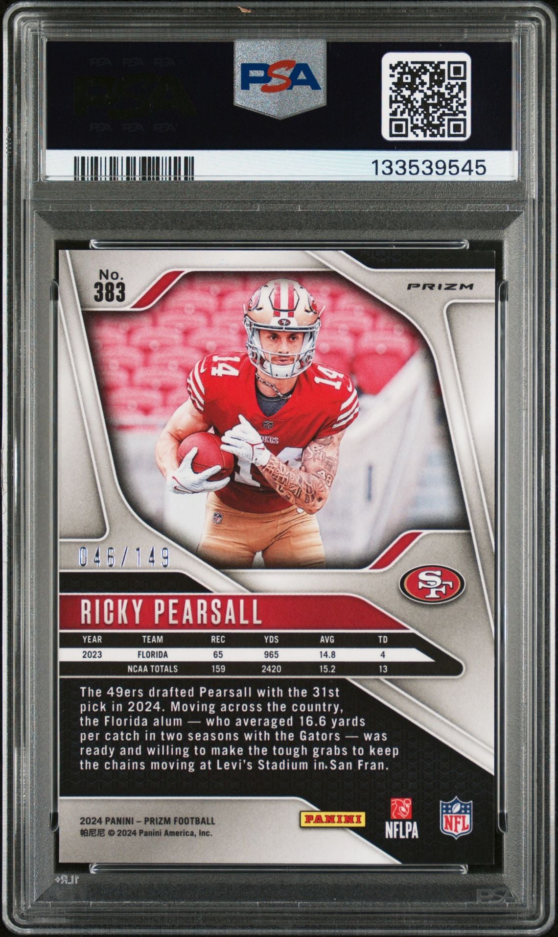 This Ricky Pearsall 2024 Panini Prizm Red Wave Signed Football Rookie Card #383 features an authenticated on card autograph. The card is professionally graded PSA 9 with autograph grade Auto 8. Serial numbered 46 out of 149. Encapsulated in a PSA holder this collectible offers strong presentation and long term protection for autograph collectors.