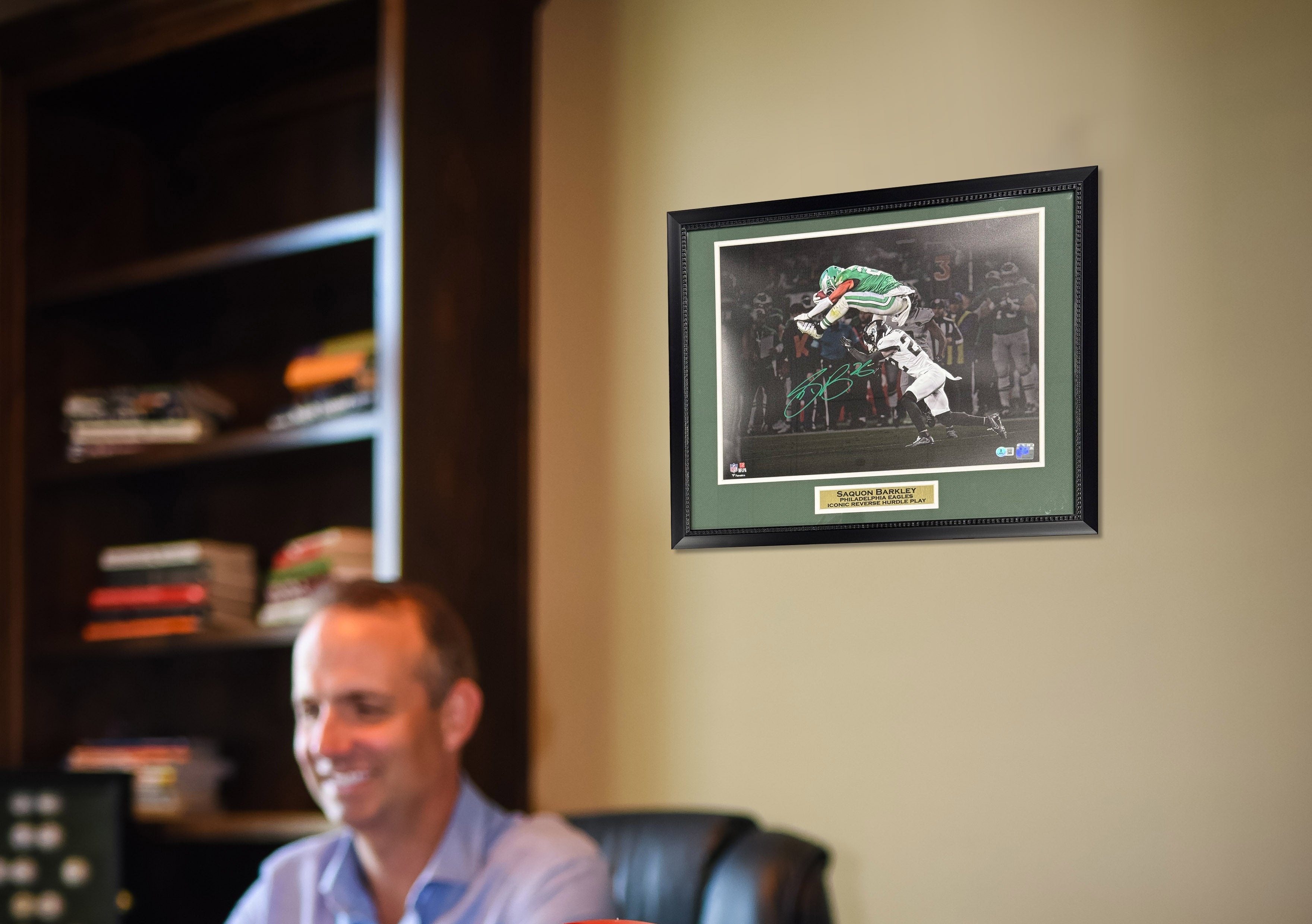Saquon Barkley Autographed Philadelphia Eagles Reverse Hurdle Signed 16x20 Framed Football Photo Beckett Authenticated COA Green