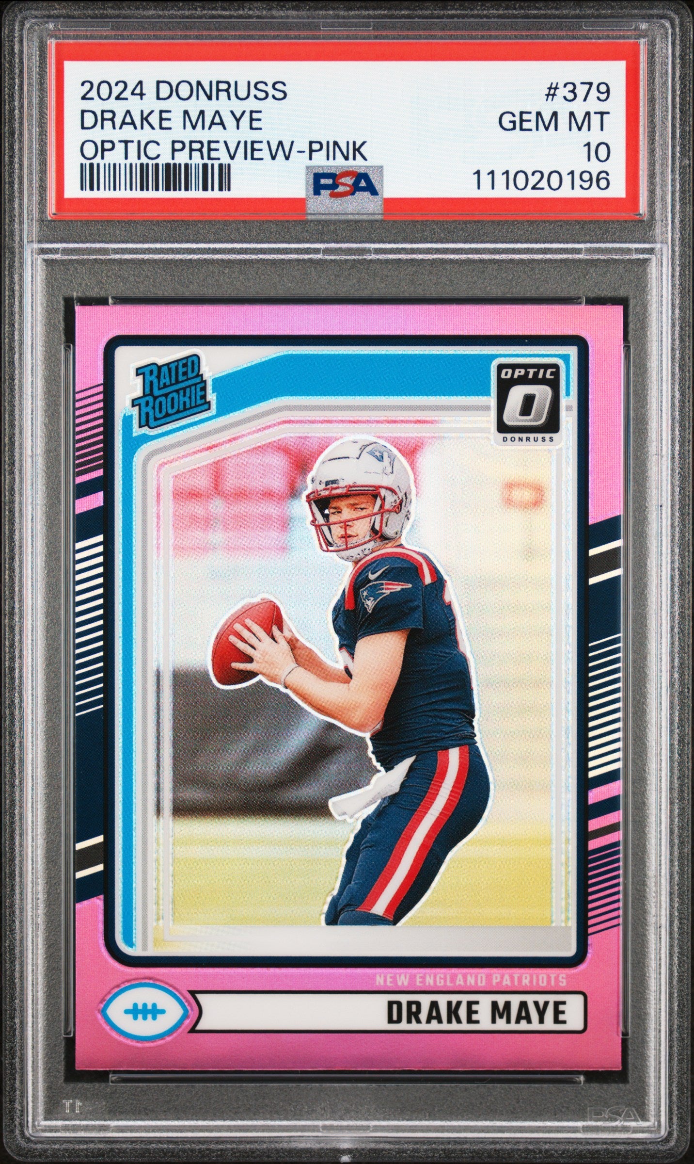 This Drake Maye 2024 Donruss Optic Preview Pink Football Rookie Card features the quarterback in the vibrant Pink parallel from the Donruss Optic Preview release. The card showcases bold color and Optic styling that adds visual pop compared to standard base cards. Graded PSA 10 this card displays gem mint condition with sharp corners clean surfaces and excellent overall presentation. Donruss Optic Preview cards are popular for their early release timing and distinctive finishes. Encapsulated in a PSA holder this rookie card is protected for long term display and collection consistency.