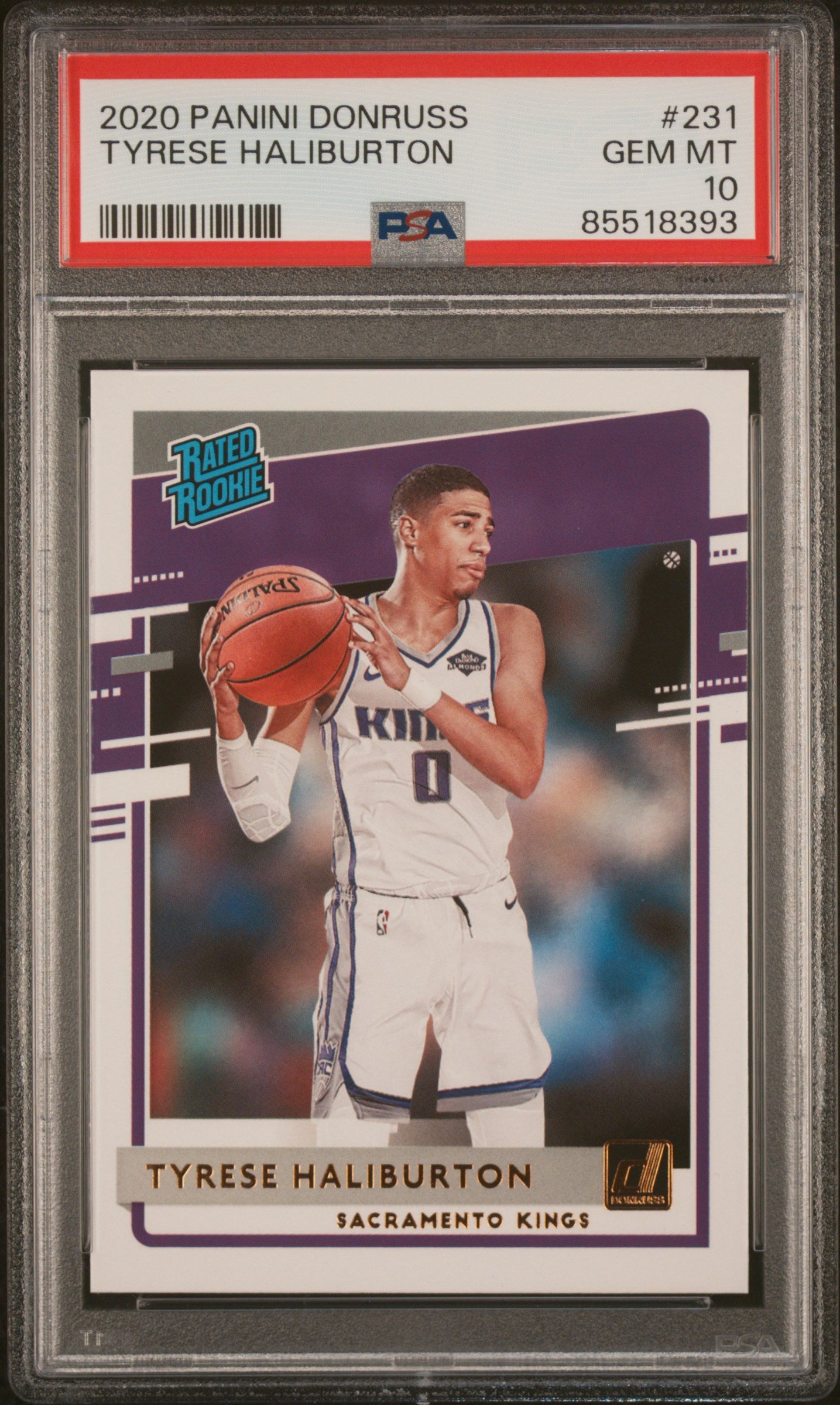 Add one of the NBAs brightest young stars to your collection with this Tyrese Haliburton 2020 Panini Donruss rookie card. Drafted 12th overall in the 2020 NBA Draft Haliburton quickly made a name for himself with his elite court vision smooth shooting stroke and high basketball IQ. He earned NBA All-Rookie First Team honors and has since become the face of the Indiana Pacers franchise.This card captures Haliburton during his exciting rookie campaign and has been professionally graded a perfect PSA 10 indicating gem mint condition.
