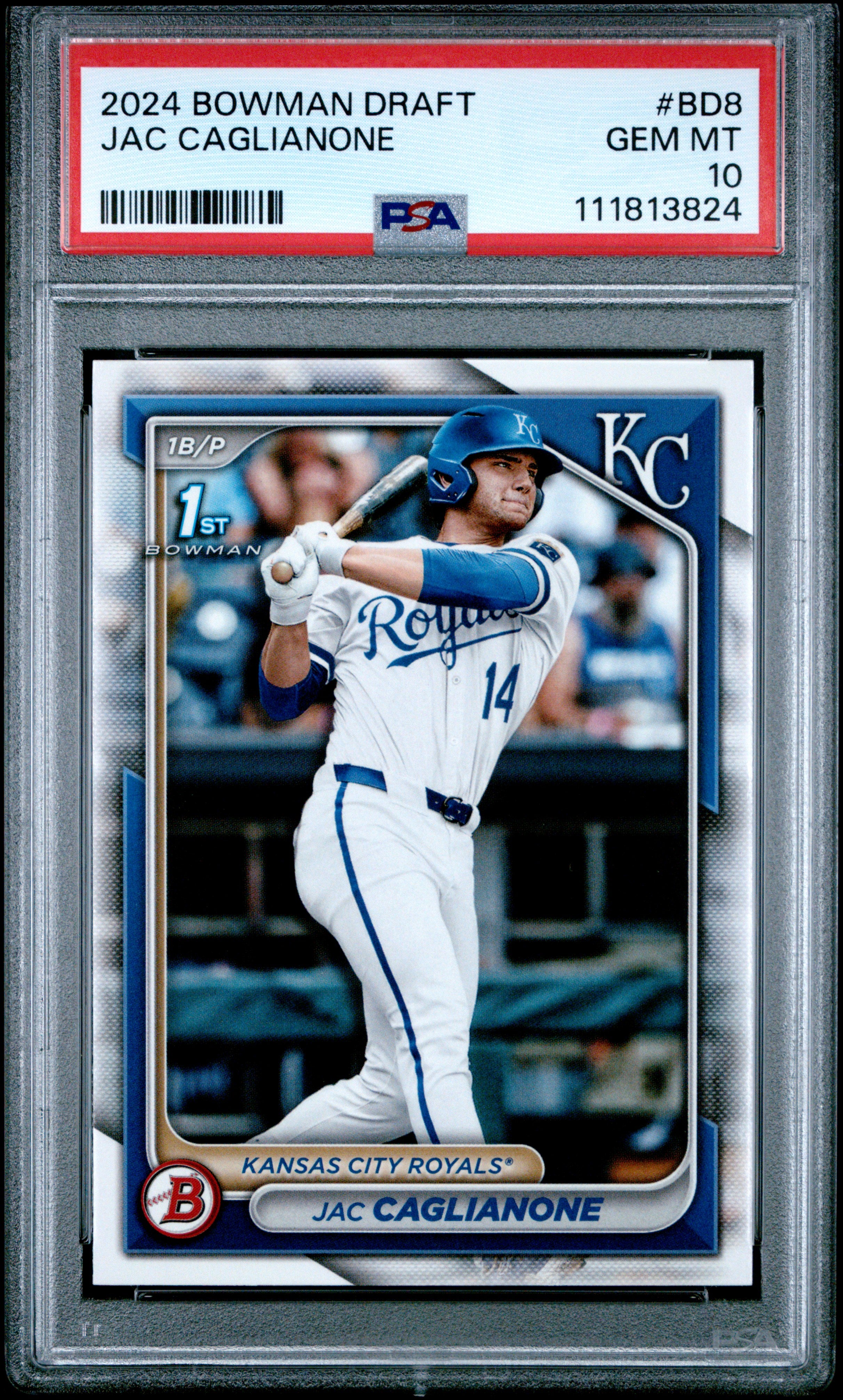 Top prospect Jac Caglianone is featured on this 2024 Bowman Draft Rookie Card Graded PSA 10 showcasing a clean design and excellent condition perfect for collectors looking to enjoy in one of the games rising stars.