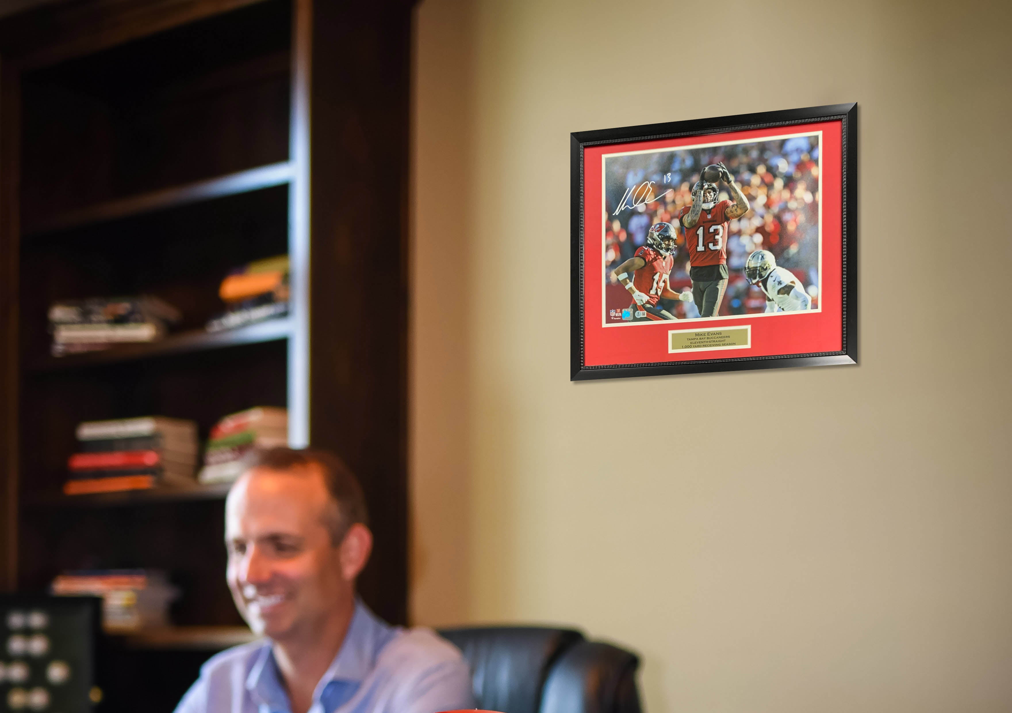 Mike Evans Autographed Tampa Bay Buccaneers Signed Eleventh-Straight 1000 Yard Receiving Season 16x20 Photo Beckett COA is a must-have collectible for football fans and memorabilia enthusiasts. This high-quality 16x20 photo features Evans authenticated signature verified by Beckett COA commemorating his historic achievement of eleven consecutive 1000-yard receiving seasons. Perfect for display this photo honors one of the NFLs most consistent and dominant wide receivers. A standout addition to any premium collection this rare piece is ideal for showcasing. Add this exceptional item to your lineup today. Frame measures 22x26 and comes ready to hang.