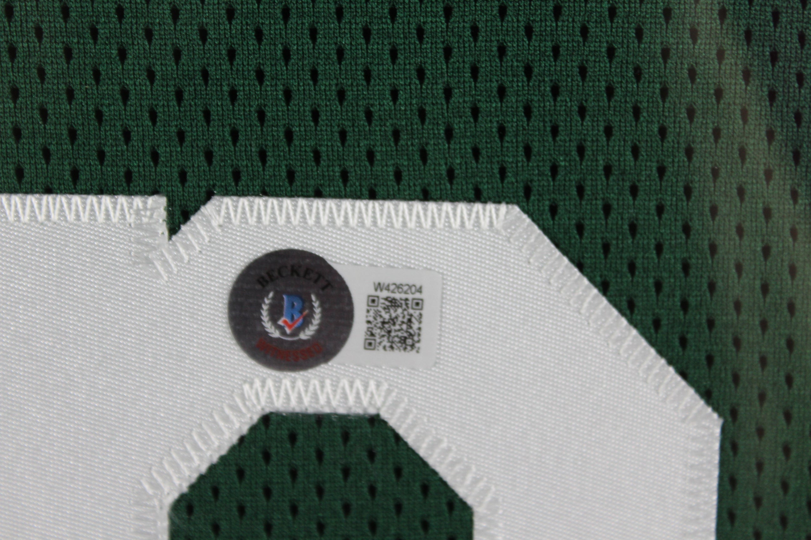 マジック ジョンソンのサインが入ったこのカレッジ スタイルのグリーン ジャージ サイズ XL の名前と番号が縫い付けられています。サインは、署名に立ち会い、アイテムに署名するのを目撃した Beckett Authentication Services (BAS) によって認証されます。フレームのサイズは35x43で、アイテムを保護するUVプレキシガラスが付属しています。画像内のぎらつきは、撮影された画像によるものです。