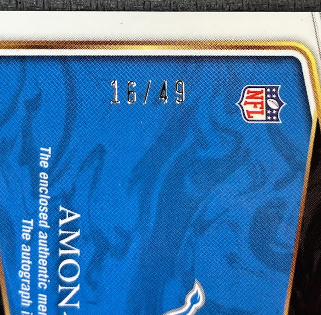 This Amon Ra St Brown 2021 Panini Select Prime Selections rookie card features a sticker autograph and a premium patch. Select Prime Selections cards are known for bold designs and limited production. Serial numbered 16 out of 49 this card offers strong rookie memorabilia appeal.
