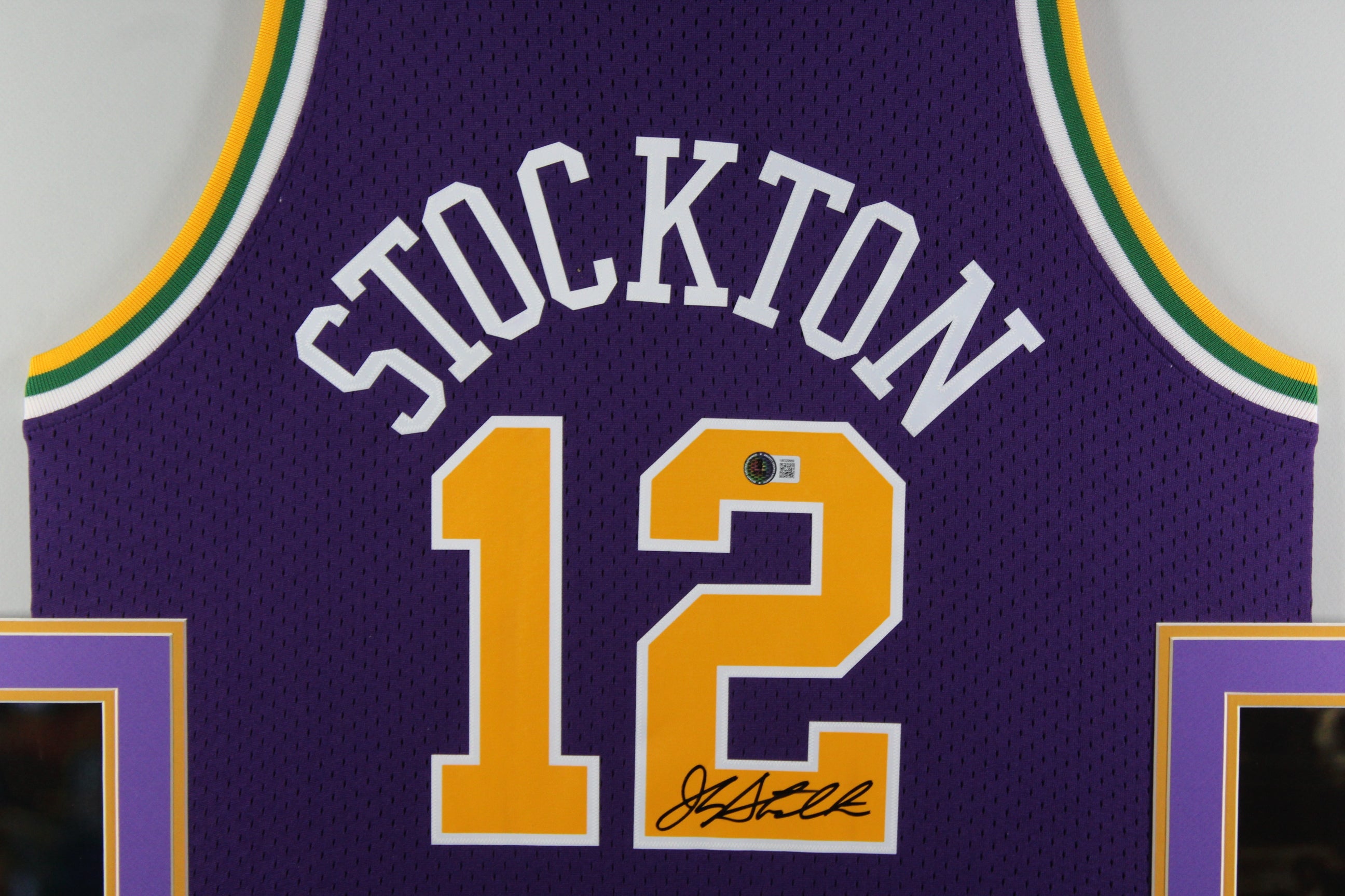 John Stockton has autographed this official Utah M&N jersey. Size XL name and numbers sewn on. Always a TOUGH autograph. These were signed in January 2024. Autograph was witnessed and authenticated by Beckett Authentication Services (BAS). Simply scan the QR code hologram on your item to verify authenticity on their site. 100% authentic. Frame measures 35x43 and comes with UV plexi glass to protect your item. Any glare in the image is just from the image being taken.